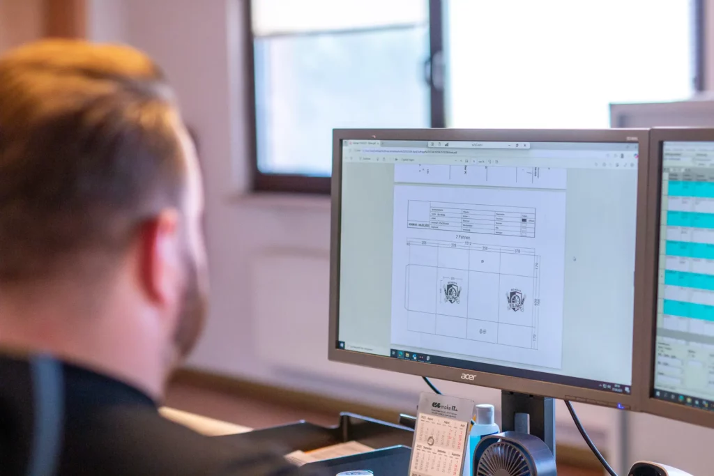 Sobald Maße und Anforderungen vorliegen, starten wir mit der Konstruktion. Wir erstellen CAD-Daten, prüfen Sonderwünsche und fertigen bei Bedarf Musterkartons. Technik und Produktion sind dabei direkt eingebunden, das sorgt für eine zügige Abstimmung.